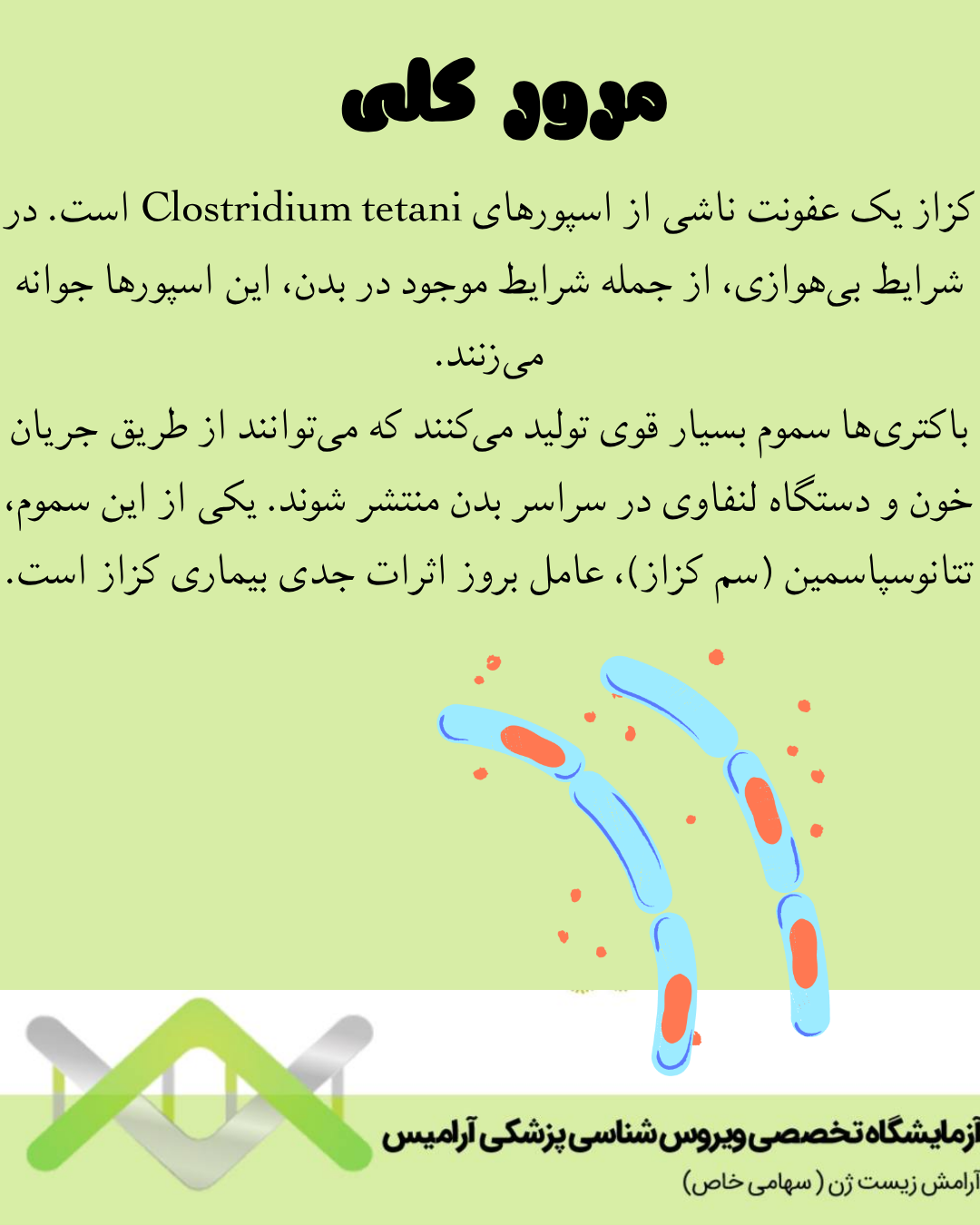 کزاز یک عفونت ناشی از اسپورهای Clostridium tetani است. در شرایط بیهوازی، از جمله شرایط موجود در بدن، این اسپورها جوانه میزنند.