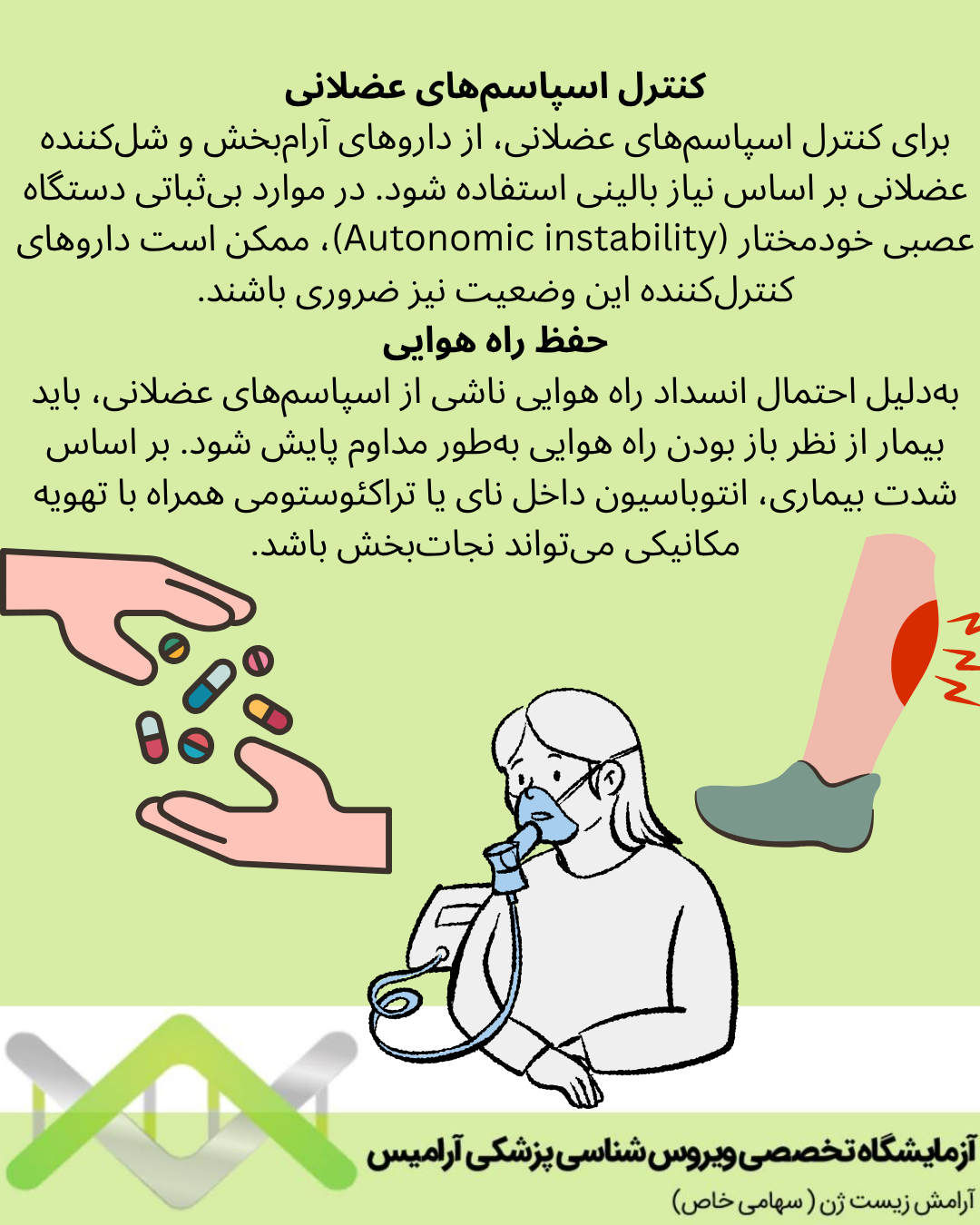 بهدلیل احتمال انسداد راه هوایی ناشی از اسپاسمهای عضلانی، باید بیمار از نظر باز بودن راه هوایی بهطور مداوم پایش شود. بر اساس شدت بیماری، انتوباسیون داخل نای یا تراکئوستومی همراه با تهویه مکانیکی میتواند نجاتبخش باشد.