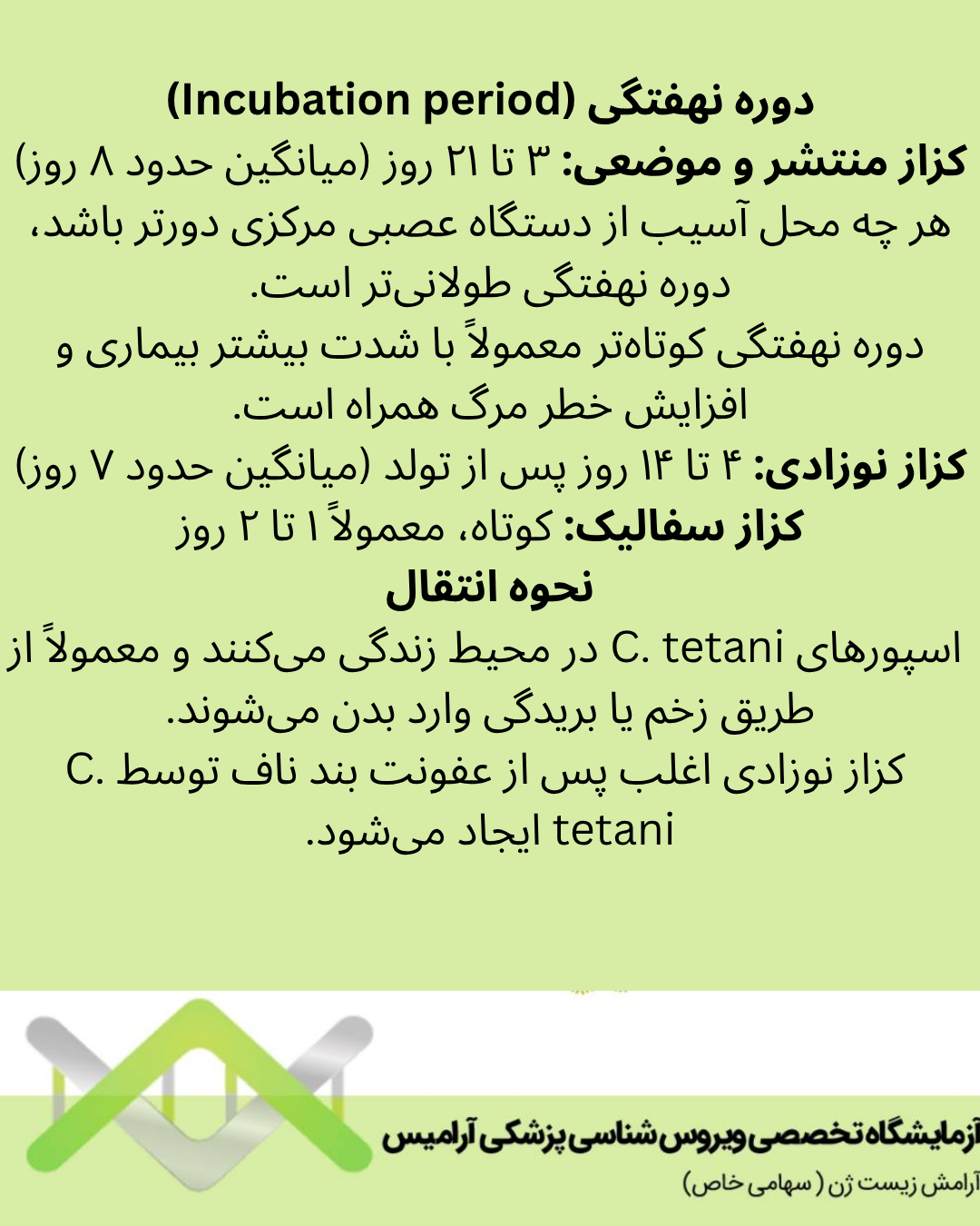 کزاز منتشر و موضعی: ۳ تا ۲۱ روز (میانگین حدود ۸ روز)